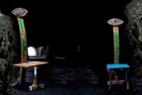 Sculture che l’autore definisce “sedute” per evocare quella posizione di riposo che per secoli ha favorito la trasmissione orale della tradizione.